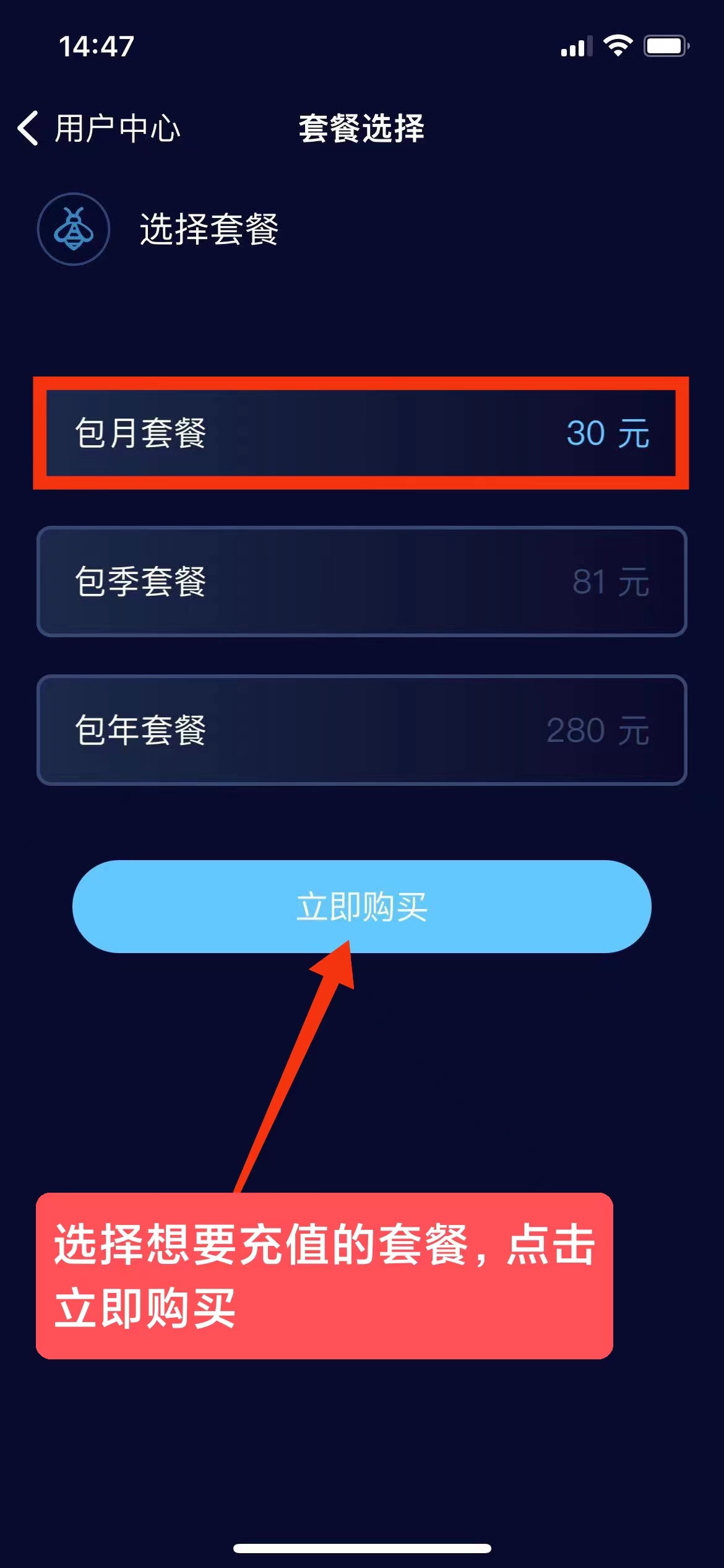 2、选择想要充值的套餐,点击立即购买