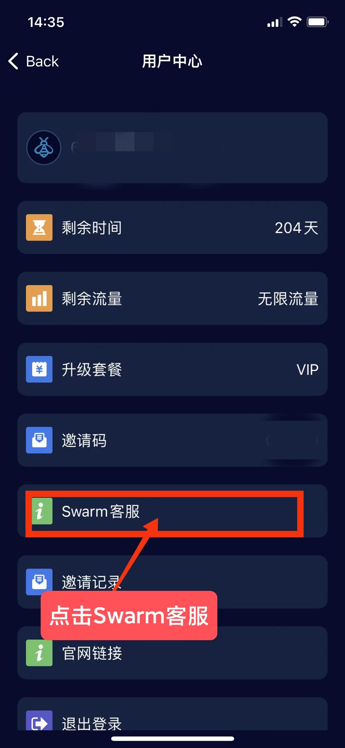3、点击ok后返回个人中心点击Swarm客服