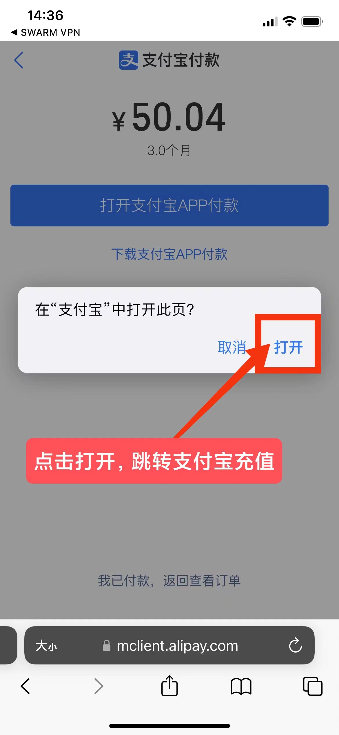 6、打开支付宝进行充值